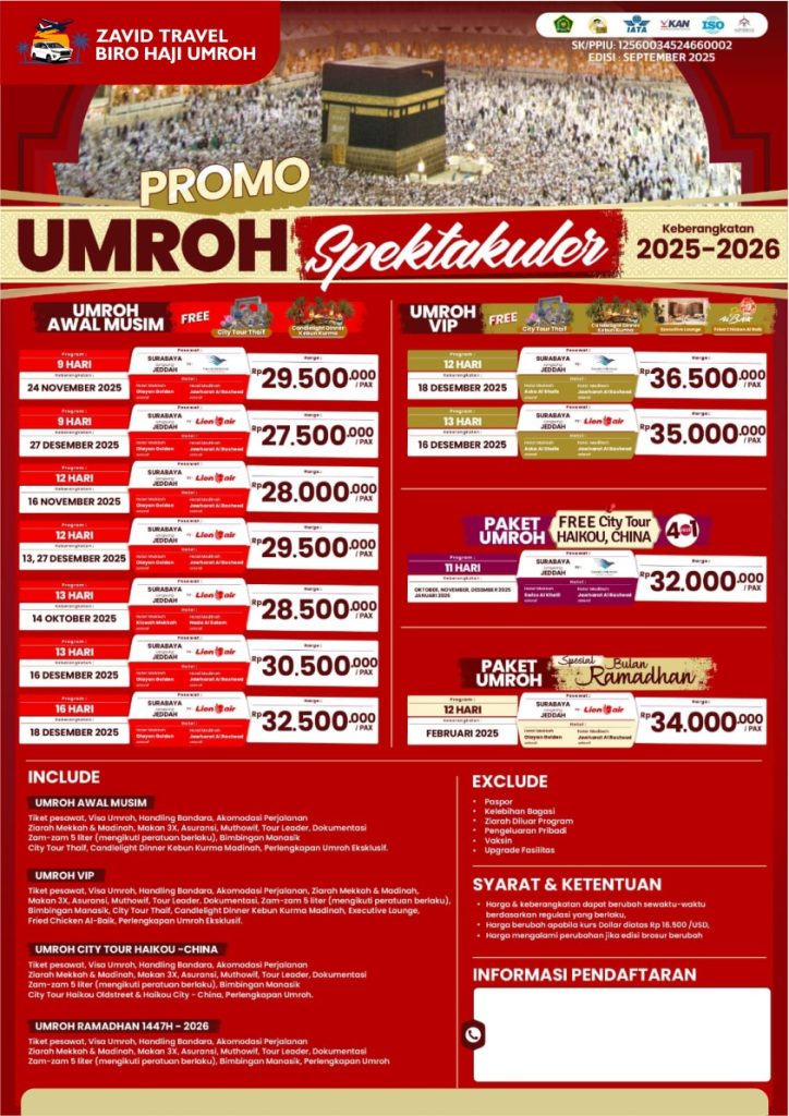 Rental Mobil Travel dan Biro Haji Umroh Sewa mobil dengan harga terjangkau dan kualitas terbaik untuk kebutuhan perjalanan Anda. Pesan Sekarang Lihat Pilihan Mobil Sewa MobilSewa mobil matic/manual di murah, tepat waktu, pemakaian dalam atau luar kota sopir ramah, berpengalaman dan profesional Haji & UmrohTemukan kemudahan dan kenyamanan dalam melaksanakan ibadah haji dan umroh dengan biro kami yang berpengalaman dan profesional TravelTemukan kemudahan dan kenyamanan dalam perjalanan Anda dengan travel yang terpercaya dan profesional Pilih Rental atau Travel Berikut beberapa pilihan kendaraan yang tersedia untuk rental dan travel: Sewa Mobil Xenia Great New Daihatsu Mulai dari Rp 350.000 Rp. 450.000 full day Muat untuk 5-6 penumpang Sudah termasuk Sopir Gratis Antar Jemput Sampai Alamat Pesan Sekarang Sewa Mobil Innova Reborn New Toyota Mulai dari Rp 450.000 Rp. 600.000 full day Muat untuk 5-6 penumpang Sudah termasuk Sopir Gratis Antar Jemput Sampai Alamat Pesan Sekarang Sewa Mobil Hiace Toyota Commuter 15 Seat Mulai dari Rp 900.000 Rp. 1.200.000 full day Muat untuk 15 penumpang Sudah termasuk solar dan Sopir Gratis Antar Jemput Sampai Alamat Pesan Sekarang